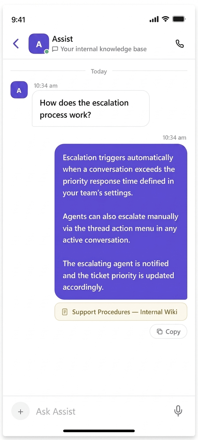 Assist lives in your team chat as a regular contact. Ask it anything - in plain language, the way you'd ask a colleague. It knows your internal procedures, policies, and documents. The answer comes back in seconds, not after three forwarded emails and a meeting.